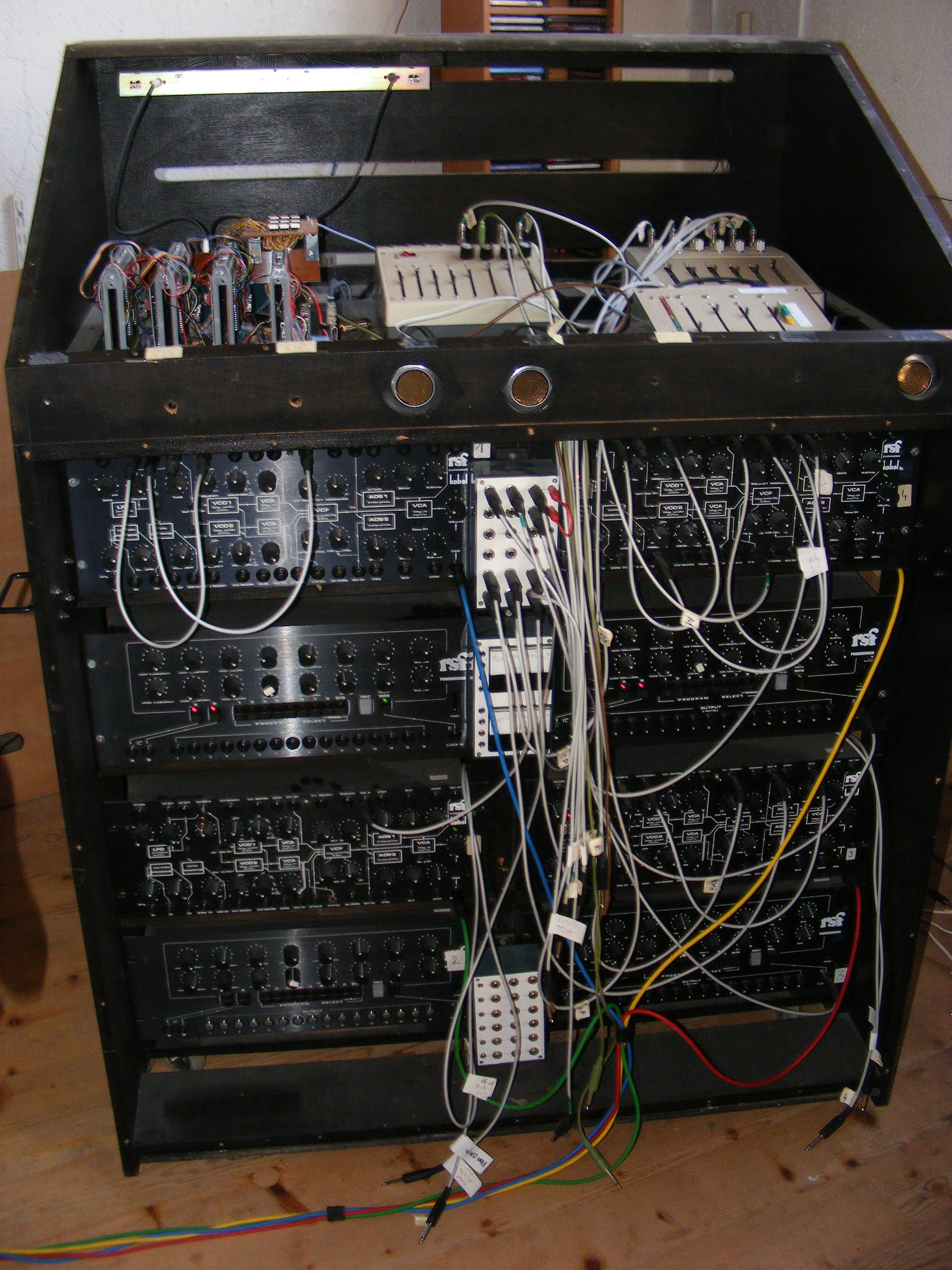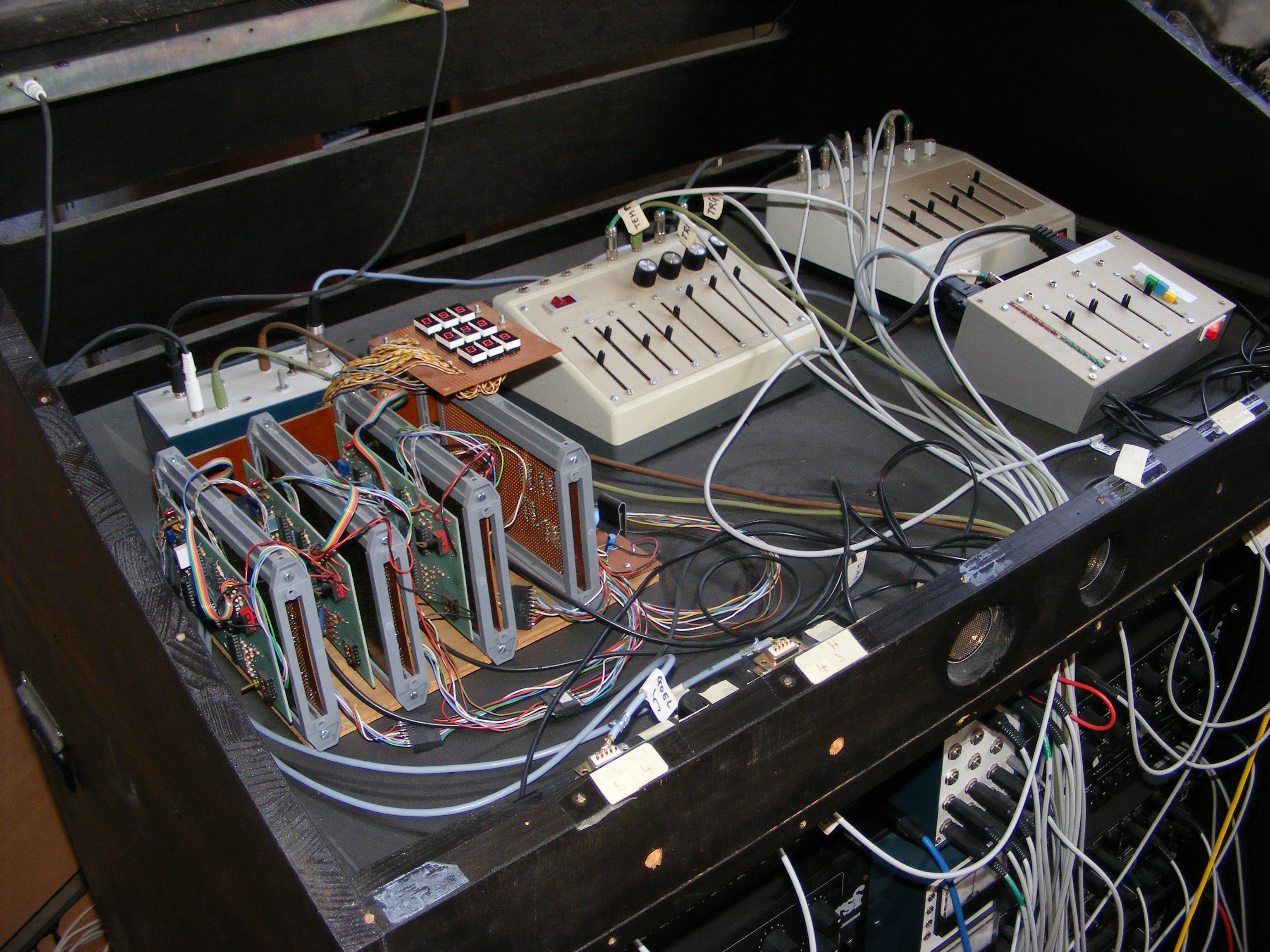 Oscar Wiggli nous rejoint, et nous conduit au studio de dessin, où le SYHAMO a été déplacé. A l'entrée de la salle, quelques sons caractéristiques des synthétiseurs Kobol résonnent déjà. Le but de notre visite est là, énorme rack noir duquel pendent des dizaines de câbles.