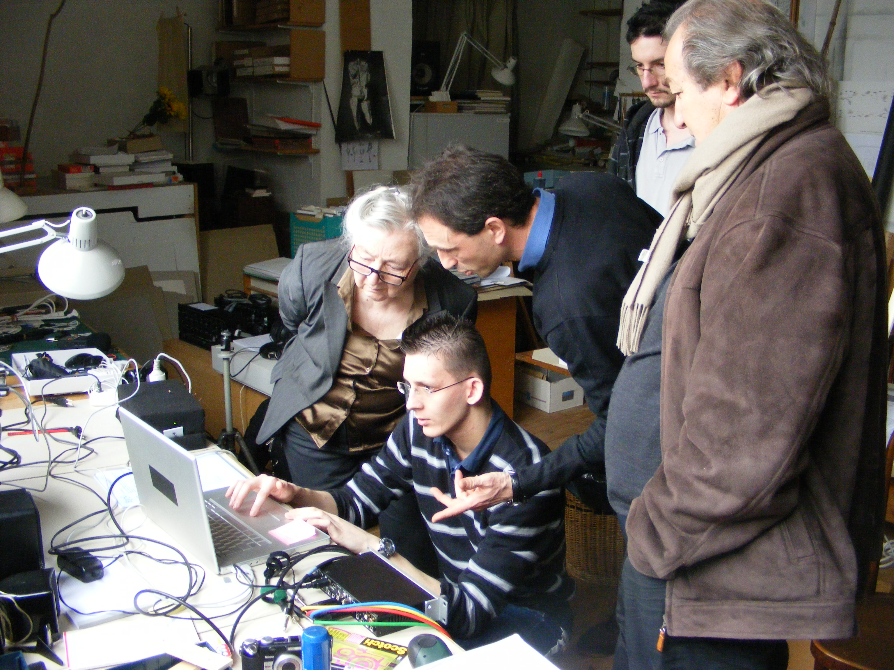 Au studio de dessin, le SYHAMO est à nouveau là, toujours aussi impressionnant (notamment pour Camille Henriot et Jean-François Charles, qui le découvrent pour la première fois). Rapidement, nous installons son "petit fils" et, après quelques tracas avec le dispositif sonore du studio, nous pouvons présenter plusieurs de nos compositions devant Oscar et Janine. C'est avec plaisir que nous constatons leur satisfaction et répondons à leurs nombreuses questions.